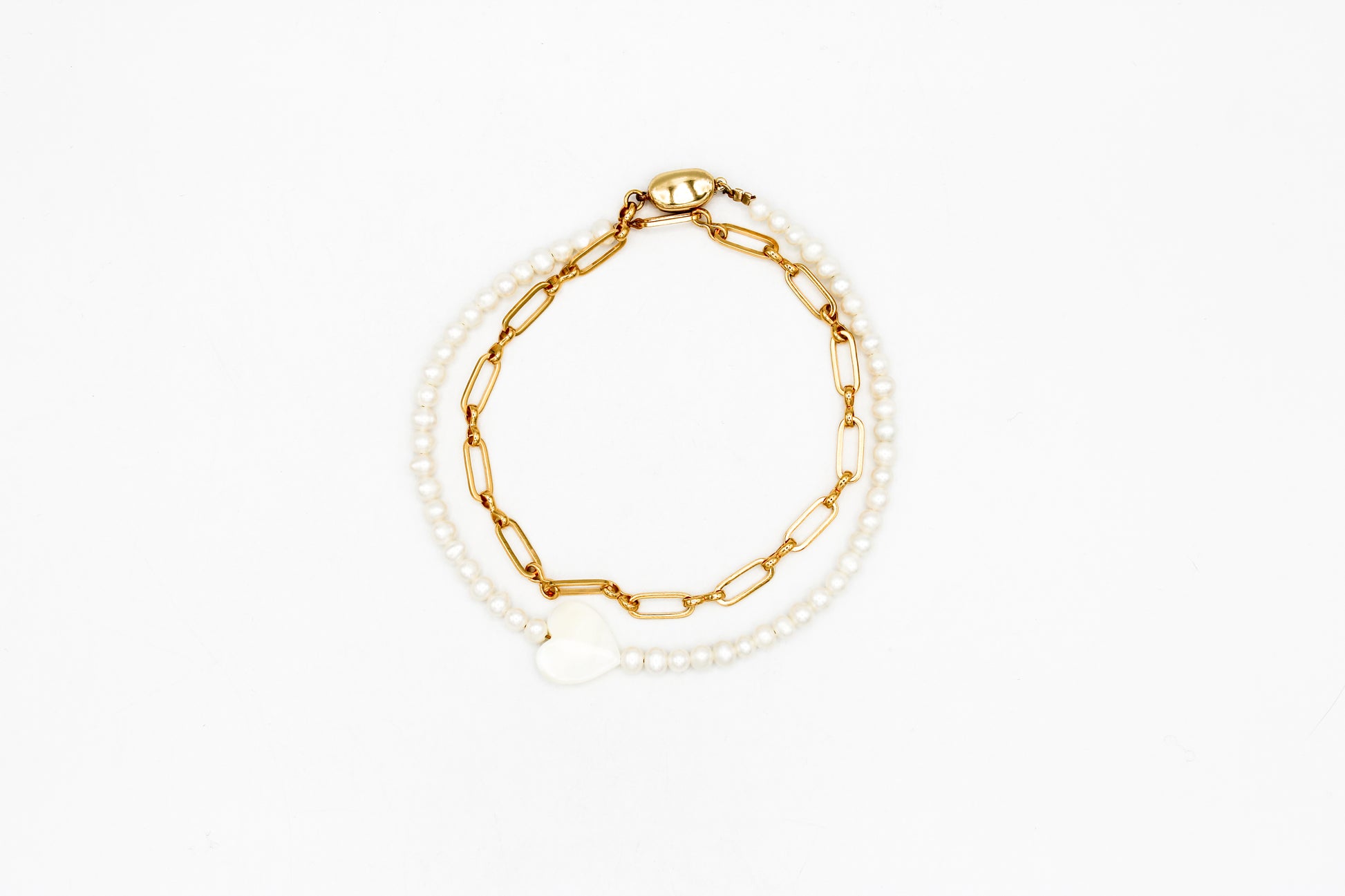 Ankle bracelet double tour with gold plated chain, pearl and small heart
