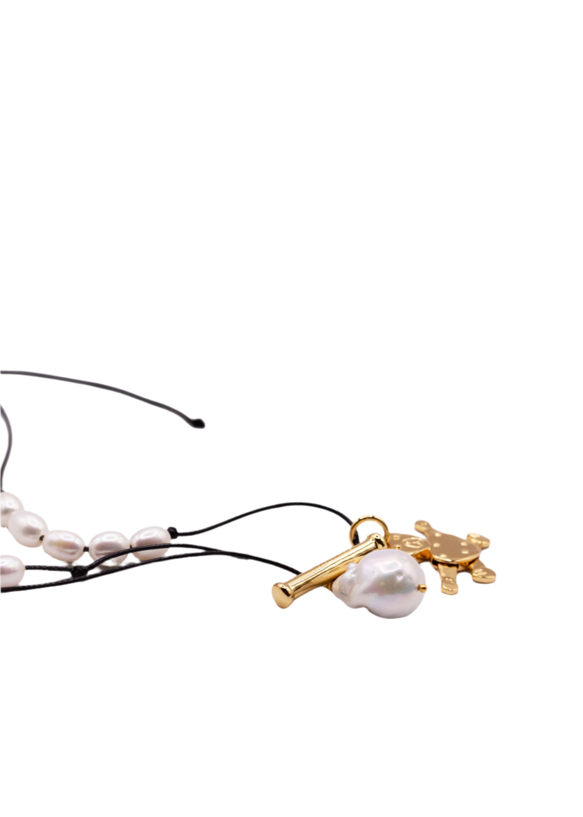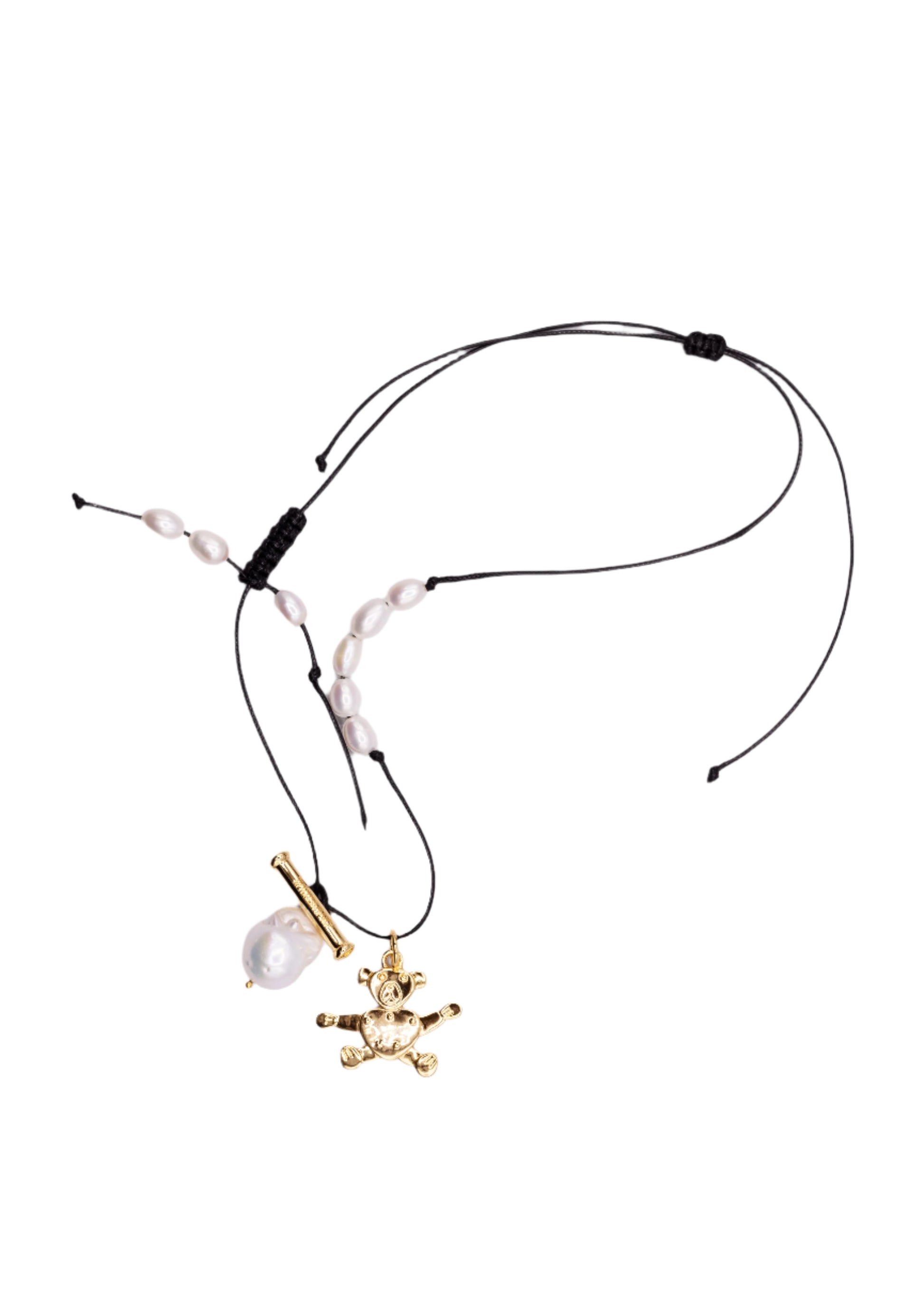 - Design: Adjustable black cord, bear charm, baroque pearls
