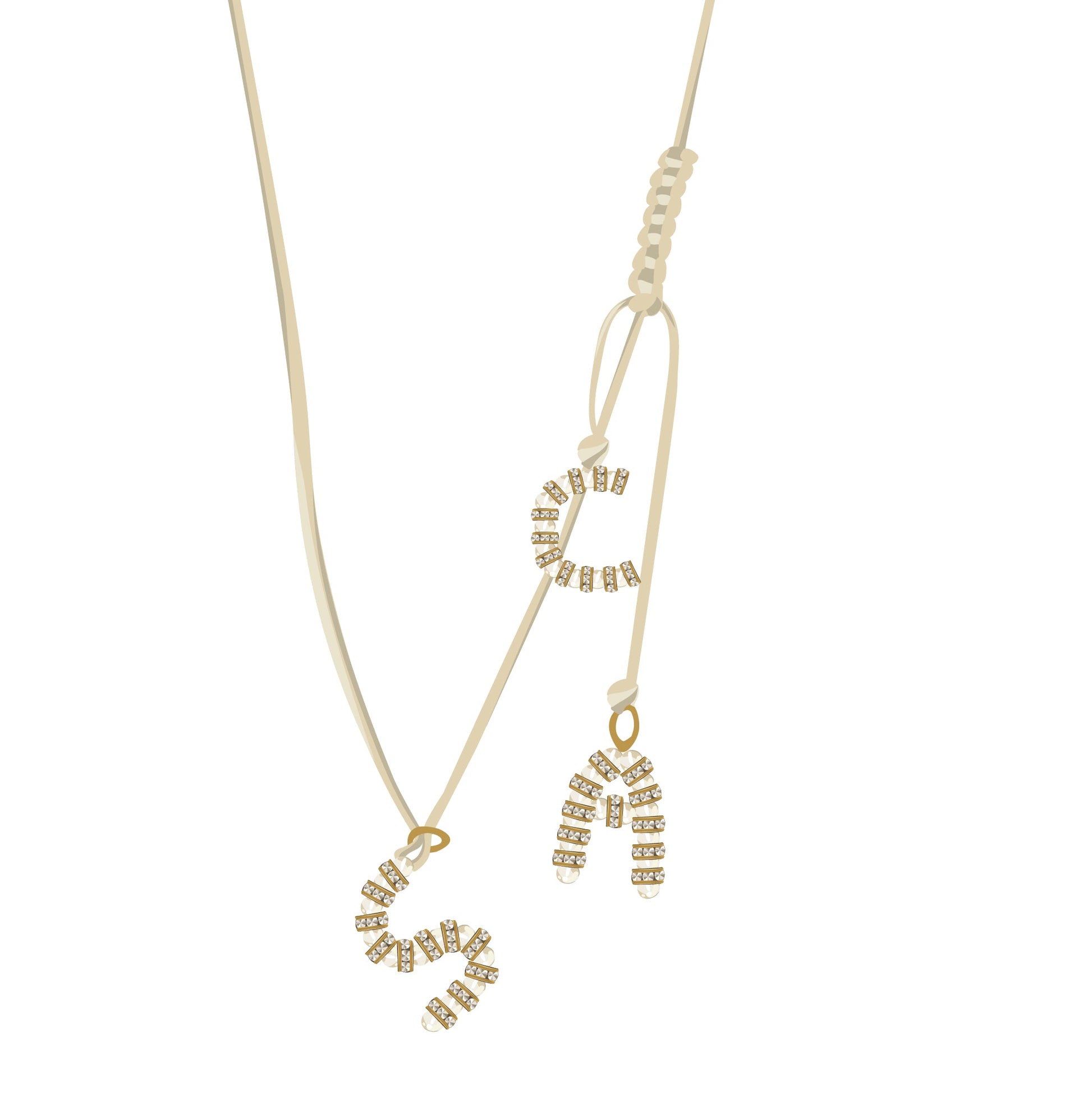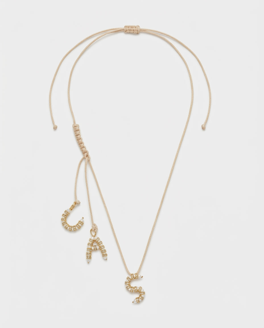 Create your own personalized necklace featuring three handcrafted gold letter pendants on a cord.
