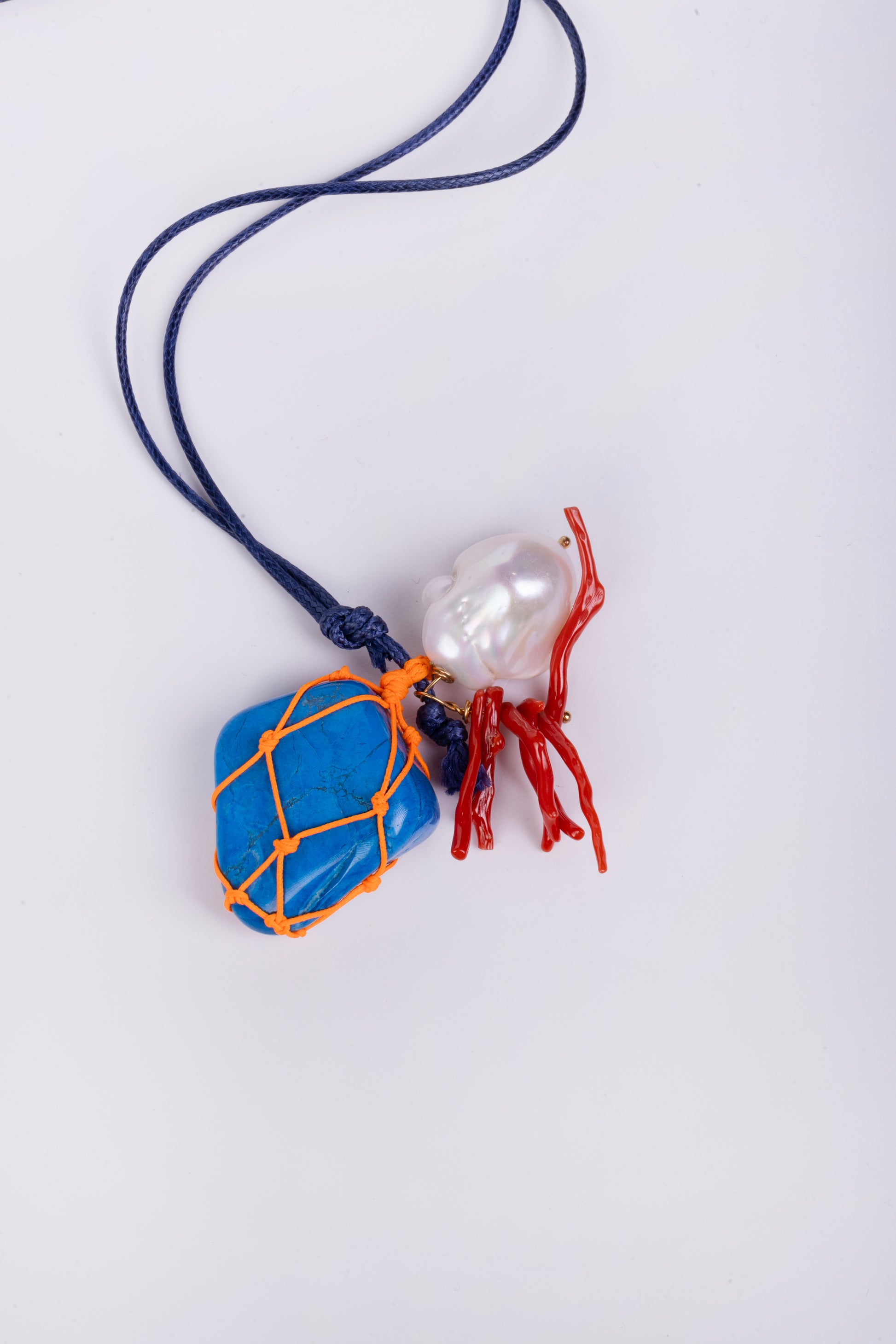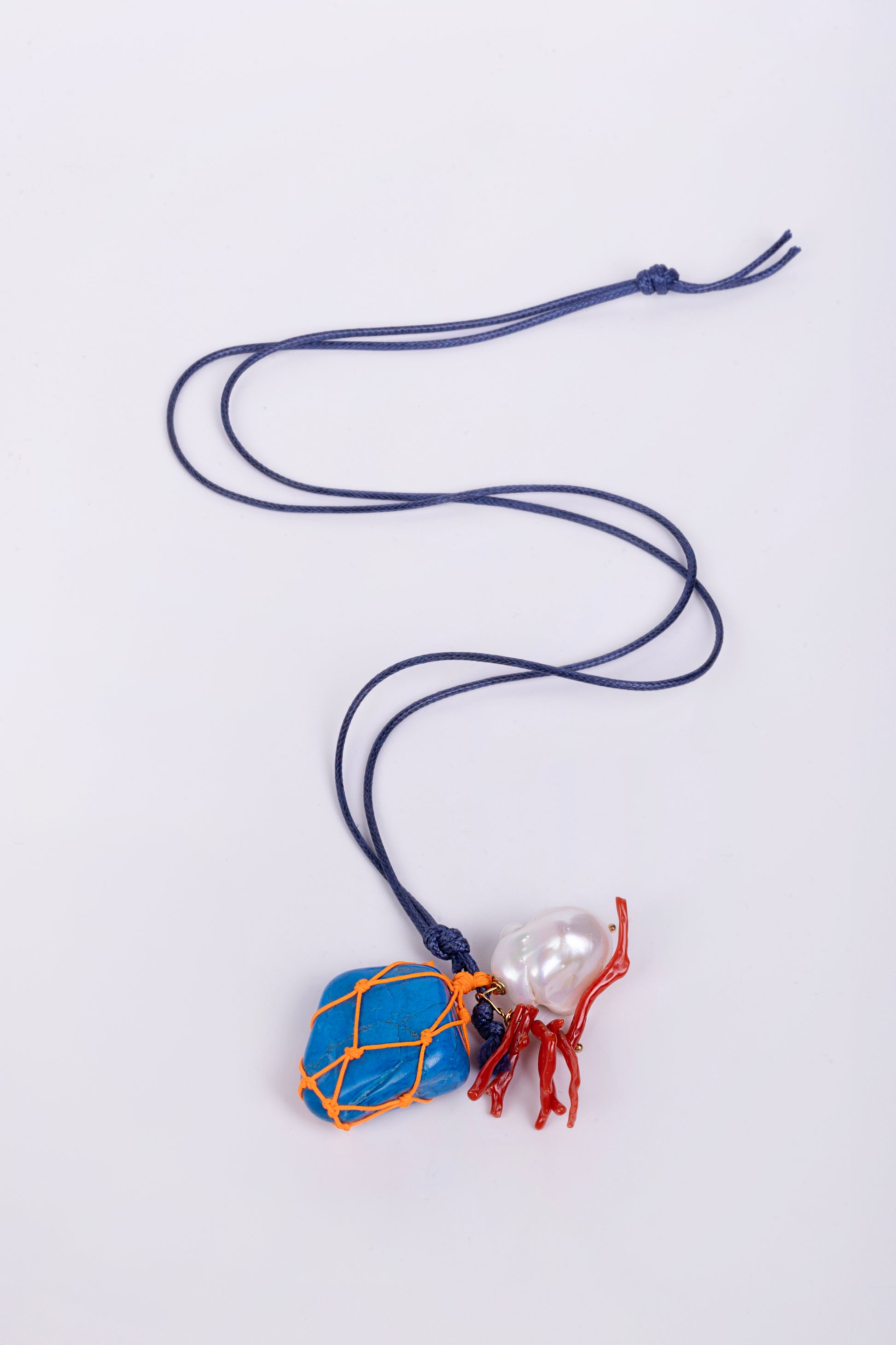 Long necklace with navy cord, baroque pearl, corals and a blue stone