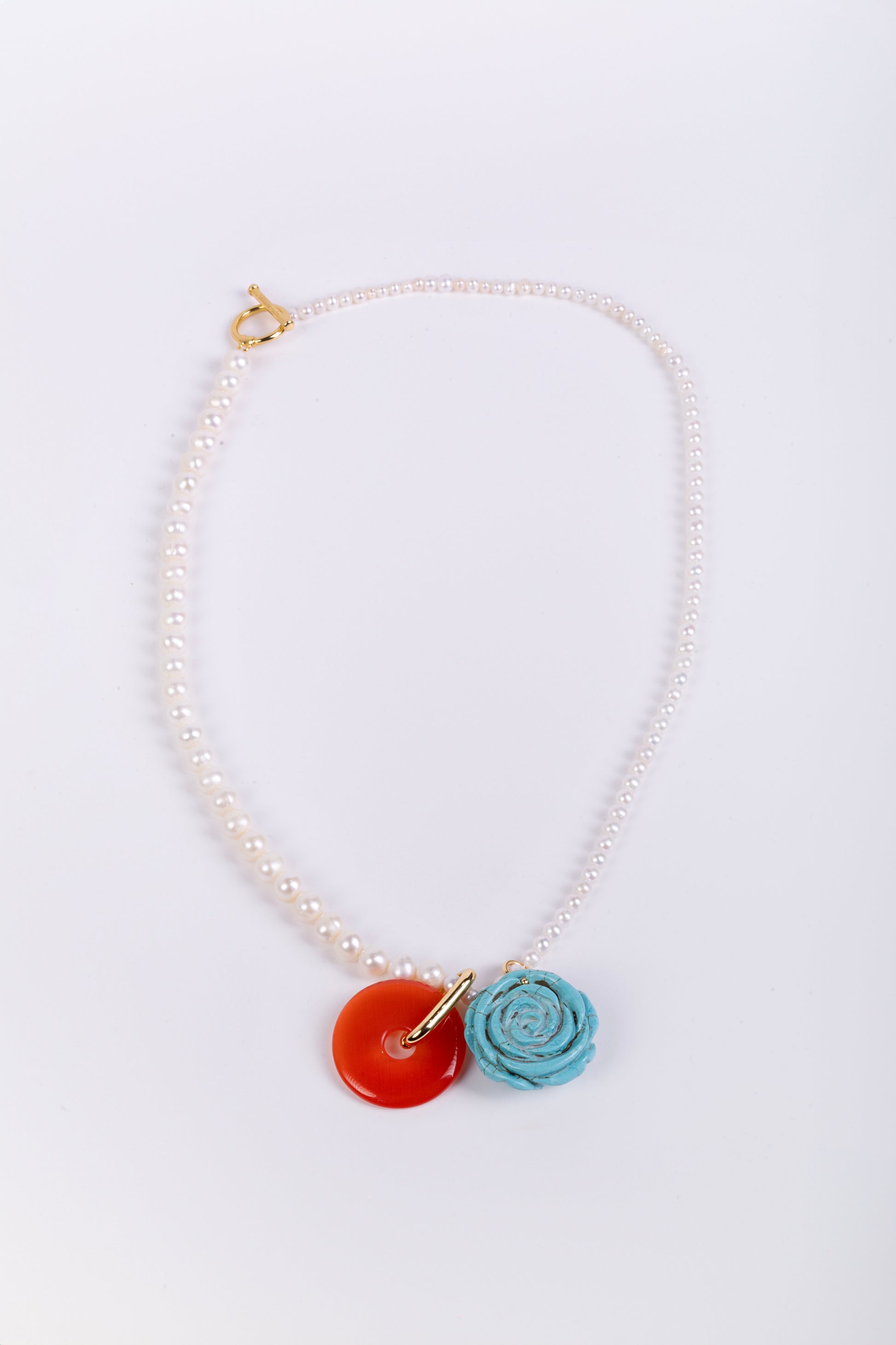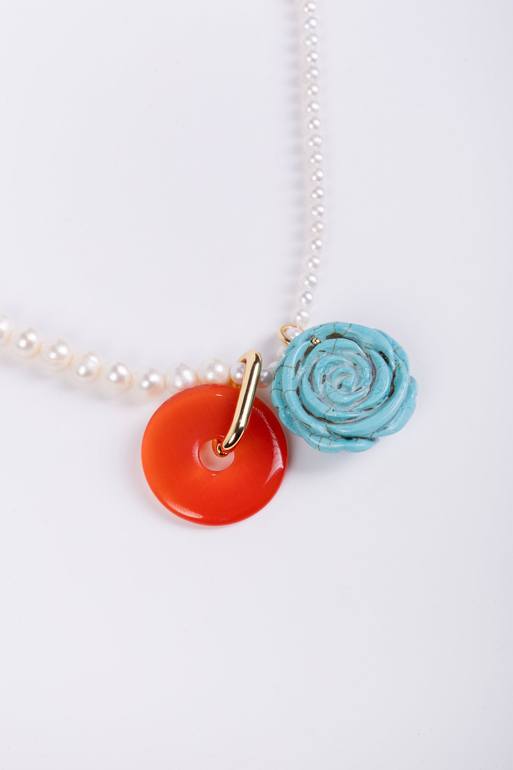 Long necklace with pearls and two charms