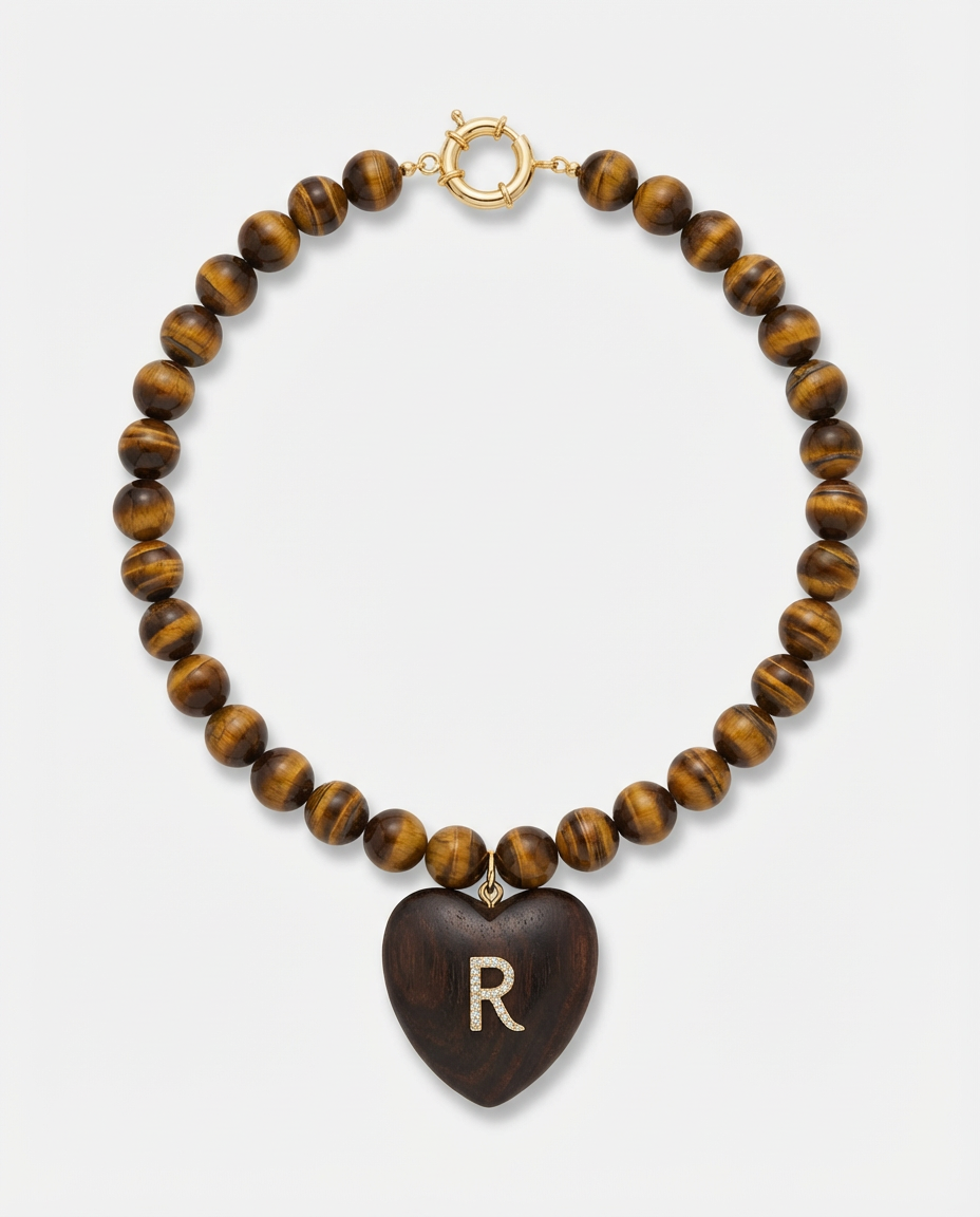Tiger beads and dark wood heart with initial